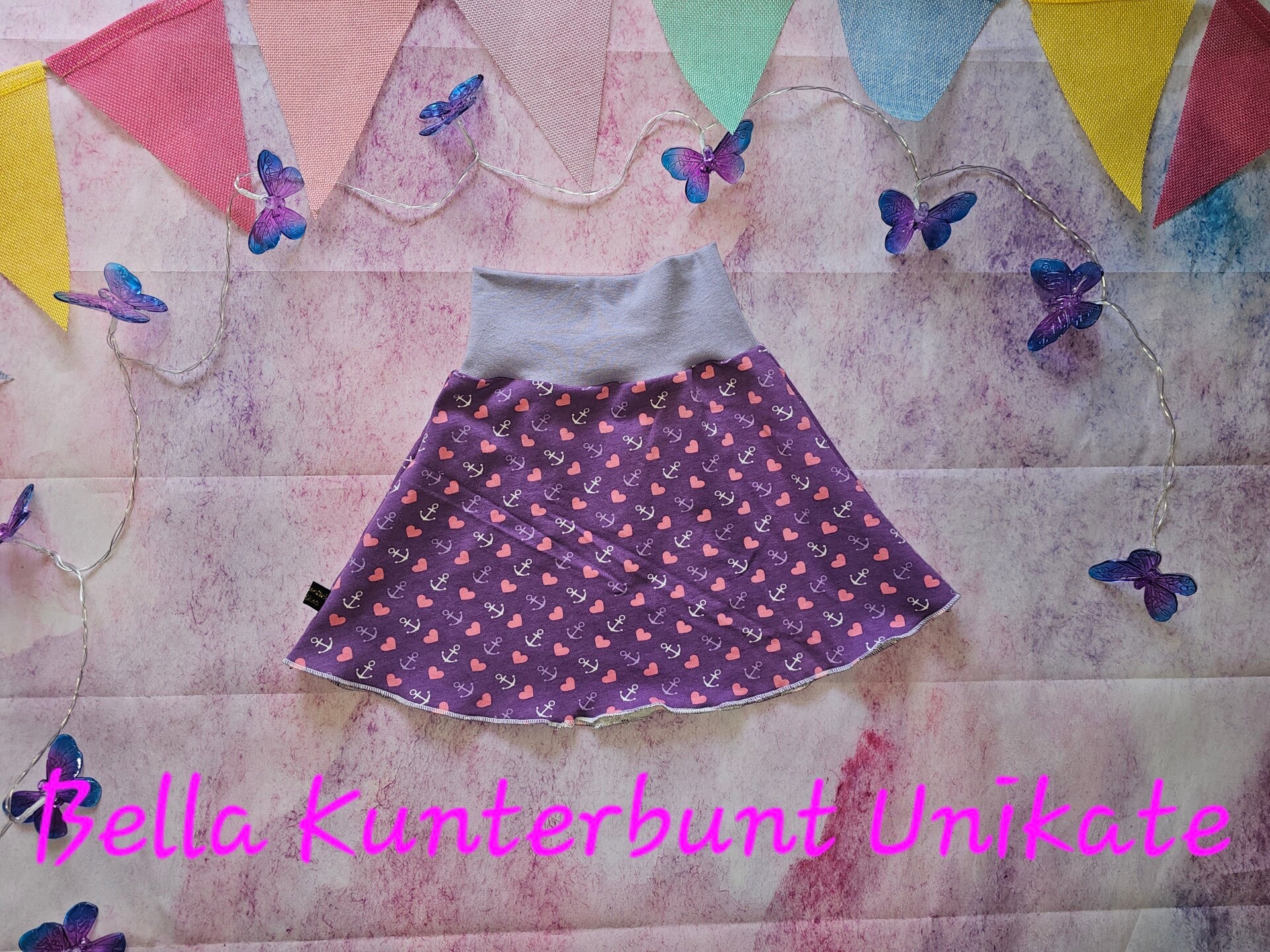 Dieser liebevoll handgefertigte Jersey-Rock in Größe 86/92 begeistert mit einem süßen Allover-Muster aus kleinen Ankern und Herzen in zarten Rosatönen auf lilafarbenem Hintergrund. Ein wunderschöner Mix aus verspielt und maritim – perfekt für kleine Herzensbrecherinnen.