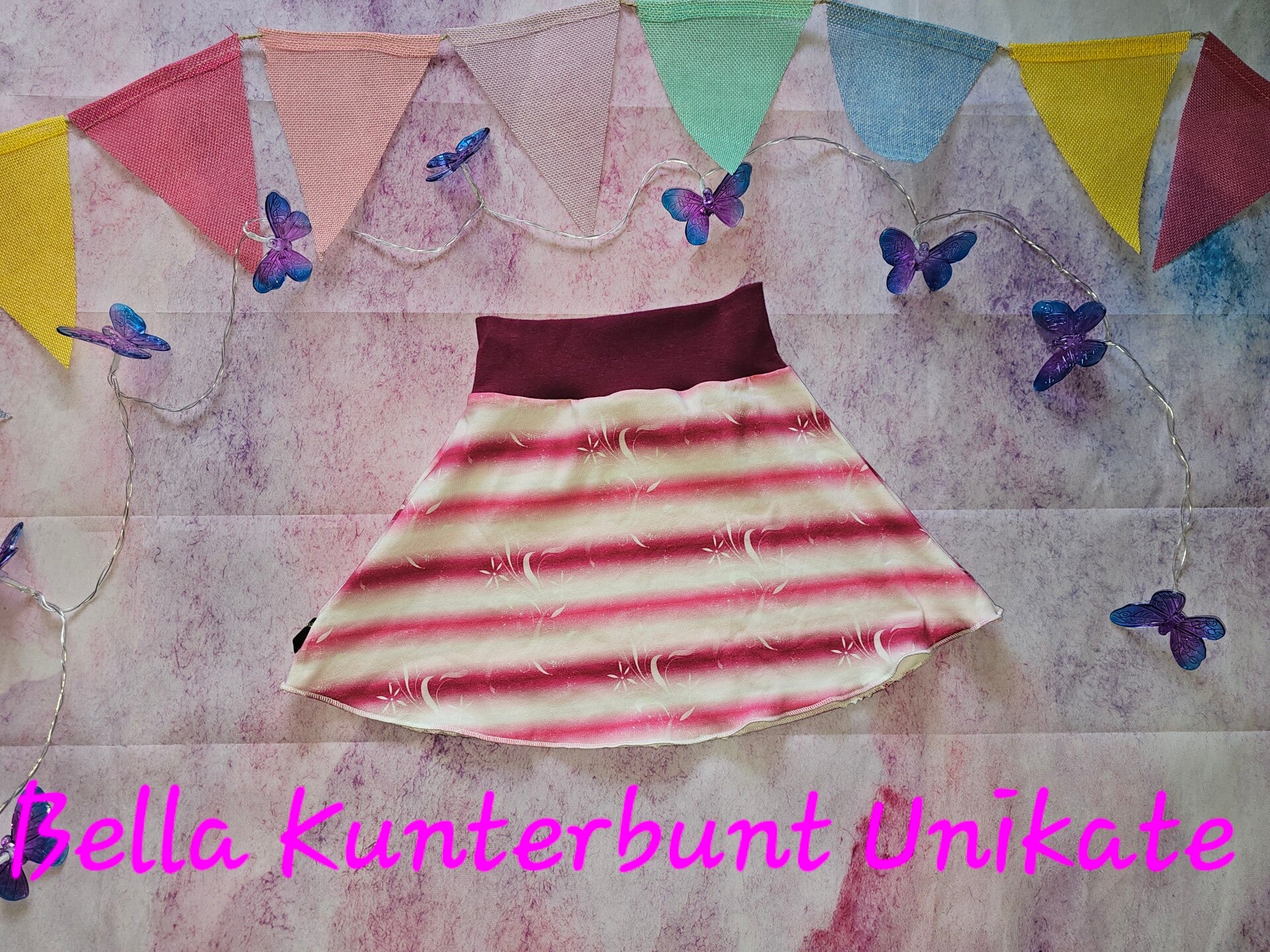 Dieser liebevoll handgefertigte Jersey-Rock in Größe 86/92 besticht durch seine harmonischen Streifen in Rosé- und Beerentönen. Zarte, eingearbeitete Blüten- und Rankenakzente verleihen dem Design eine besondere, verträumte Note.